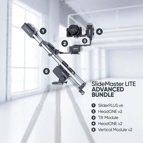 Motorized camera slider with up to 90cm travel, bundled with Vertical Module for vertical movements and Tilt Module for -90° to +90° motorized tilt. App-controlled multi-axis motion.