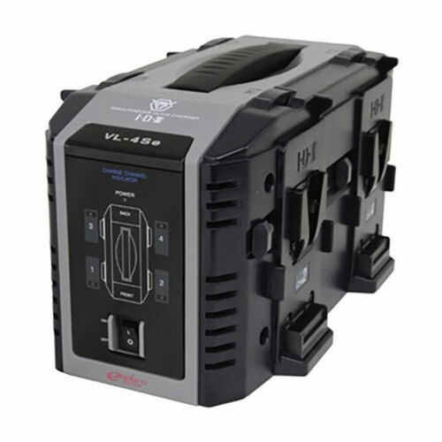4-channel simultaneous V-Mount charger. 2.7A per channel (4 channels) or 3A (1–3 channels). AC 100–240V input. High-impact polycarbonate enclosure with carrying handle. 3.0kg.