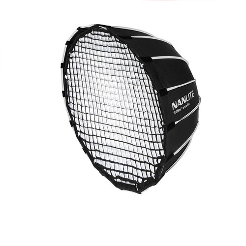 Professional 60cm parabolic softbox for the Nanlite Forza 60 LED monolight, featuring a 16-sided reflective design with removable diffuser. Includes optional fabric grid that controls light spill and tightens beam angle to 40° for enhanced directionality and contrast. Ideal for portrait, interview, and video work requiring soft, controlled illumination.